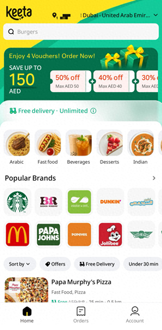 在阿联酋迪拜,用户可通过Keeta下单多种品类、多个品牌的餐品外卖服务。